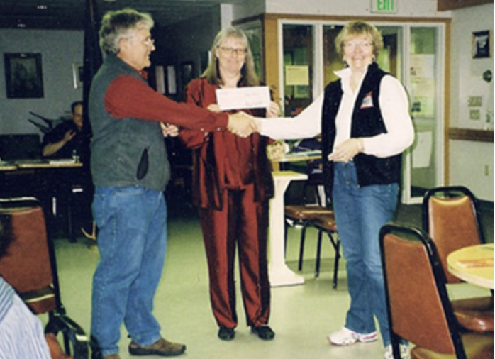 The Pioneers of Alaska Men's and Women's Igloo #6 presented $10,000 to the Whale Project, the community group which will place a life-sized humpback whale sculpture and fountain on Juneau's waterfront in recognition of the 50th anniversary of Alaska statehood.